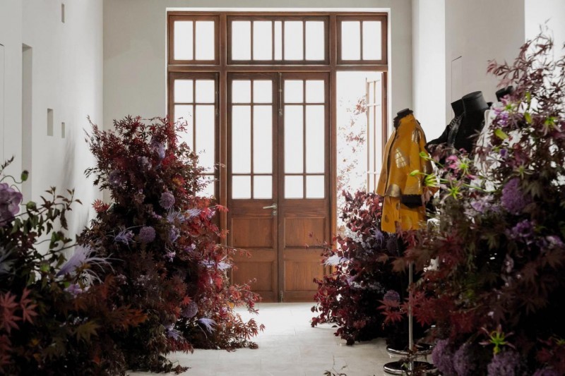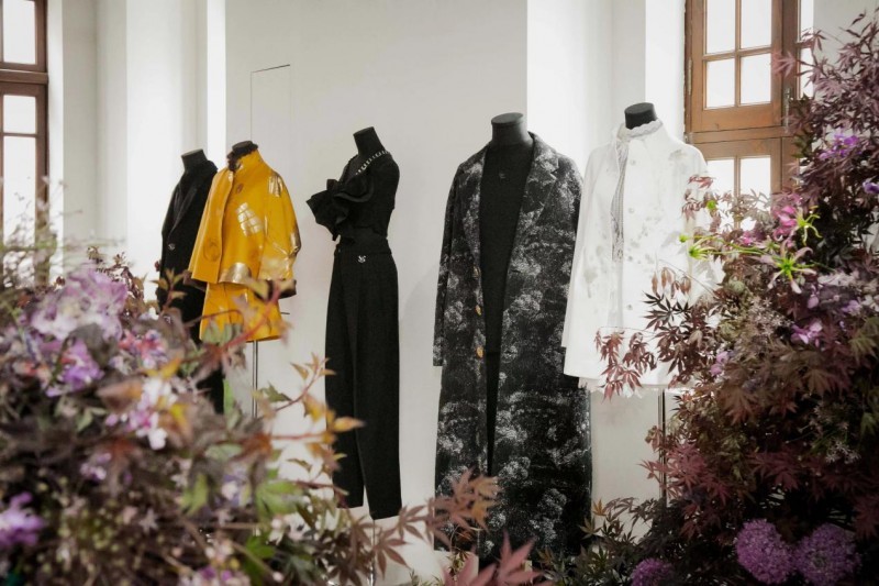墨色晕染的独特「花中花」纹样贯穿整个系列 ,结合品牌经典玉石元素 ,将本季亮点「墨兰 花」点缀于服装、包款之上 ,层层刺绣墨花间 ,探索墨痕温度同时 ,表达东方文化底蕴。呼 应方正的墨条形体 ,简洁的长立方型服装轮廓在本季大幅出现。此轮廓亦类似 60 年代的西 式套装剪裁 ,当东方诗意与西方时尚美学相加融 ,无声讲述品牌 46 年来融贯中西的独到匠 心语汇。本季关键性的搭配「套装」 ,通过西式毛料 ,采用讲究中式剪裁 ,推出同一概念、中西对照款式 ,再次展现夏姿陈对于中西融合的熟稔技艺。
