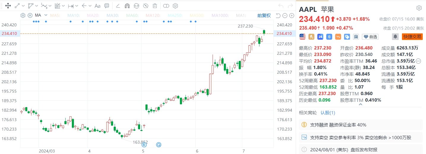 苹果收涨1.68%报234.41美元,创历史收盘新高,总市值3.59万亿美元。消息上,苹果公司被摩根士丹利列为首选股,摩根士丹利认为这家科技公司人工智能平台的推出将引发用户升级智能手机、平板电脑和电脑的创纪录热潮。