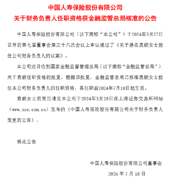 7月18日金融一线消息,中国人寿今日发布关于财务负责人任职资格获金融监管总局核准的公告。公告显示,公司于2024年3月27日召开的第七届董事会第三十六次会议上审议通过了《关于提名袁颖女士担任公司财务负责人的议案》。