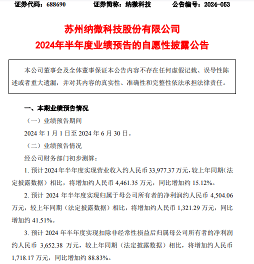 纳微科技2024年上半年预计净利4504.06万同比增加41.51% 仪器产品收入占比增加
