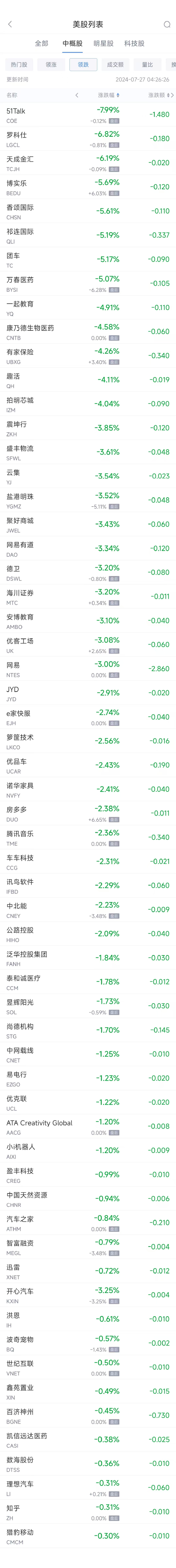 领跌中概股列表:
