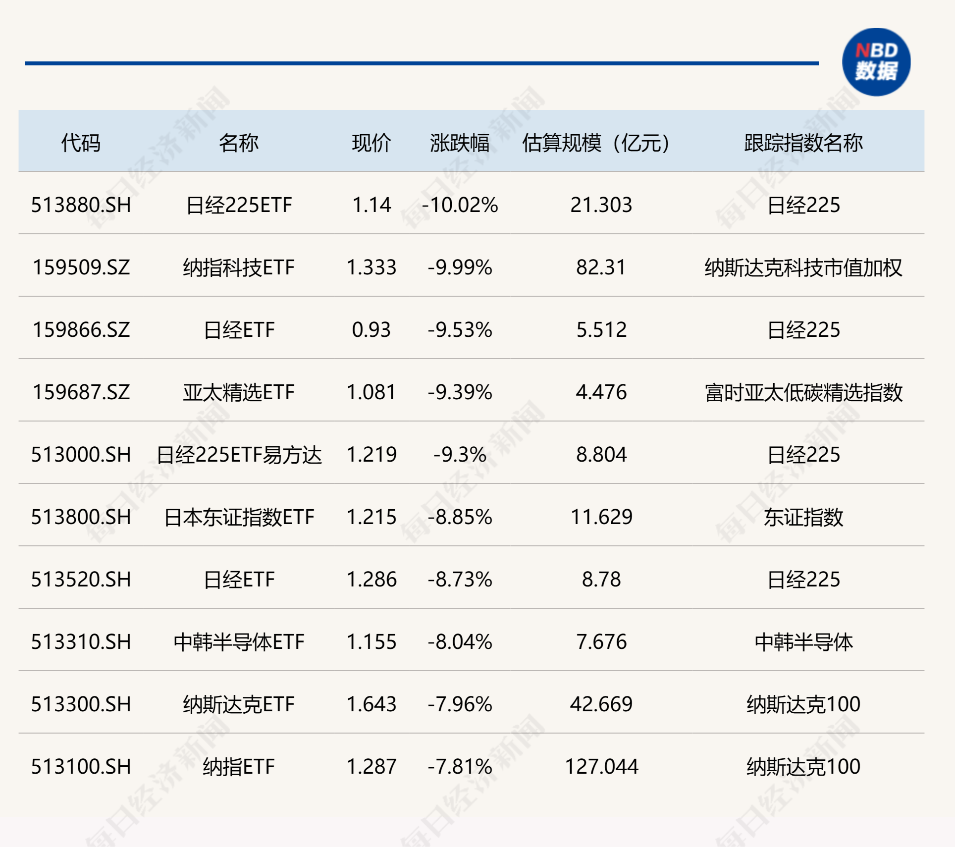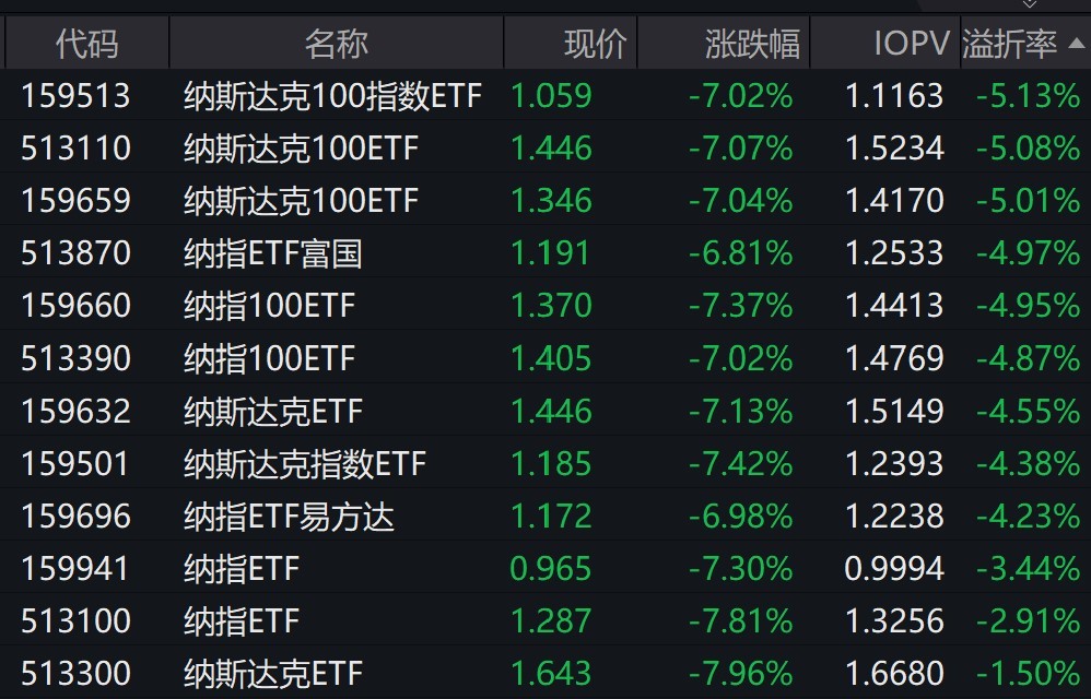 ETF今日收评 | 日经225ETF、纳指科技ETF跌停,纳指100相关ETF集体出现折价