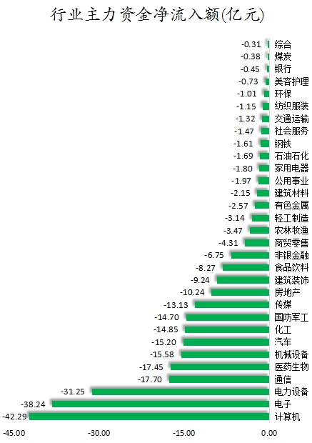 从行业来看,申万所属的31个一级行业,今日所有行业主力资金都呈现净流出,其中,计算机行业主力资金净流出最多,净流出金额为42.29亿元;行业主力资金净流出靠前的还有电子、电力设备、通信、医药生物、机械设备、汽车,净流出金额分别为38.24亿元、31.25亿元、17.7亿元、17.45亿元、15.58亿元、15.2亿元。