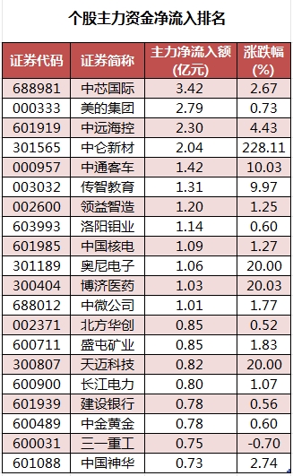 从个股来看,今日有1639只个股获主力资金净流入,其中,12股获主力资金净流入超1亿元。中芯国际主力资金净流入最多,净流入金额为3.42亿元;主力资金净流入居前的个股还有美的集团(000333)、中远海控(601919)、中仑新材、中通客车(000957)、传智教育,净流入金额分别为2.79亿元、2.3亿元、2.04亿元、1.42亿元、1.31亿元。