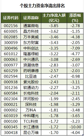 此外,3433只个股被主力资金净卖出,其中,52股被主力资金净卖出超1亿元。主力资金净流出最多的个股是通富微电(002156),净流出金额为3.85亿元;主力资金净流出居前的个股还有晶方科技(603005)、万丰奥威(002085)、东方财富(300059)、中科创达(300496)、隆基绿能,净流出金额分别为3.62亿元、3.46亿元、3.43亿元、3.35亿元、3.22亿元。