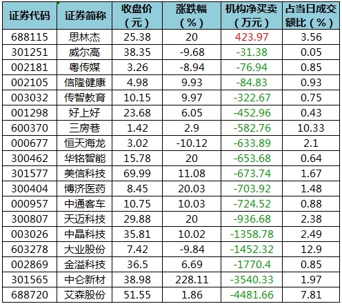 盘后龙虎榜数据显示,今日机构席位资金合计净卖出约1.81亿元。其中,净买入的个股1只,净卖出的个股17只。机构净买入的股票是思林杰,净买入金额约423.97万元;机构净卖出最多的股票是艾森股份,净卖出金额约4481.66万元;机构净卖出居前的还有中仑新材、金溢科技(002869)、大业股份(603278)等股。