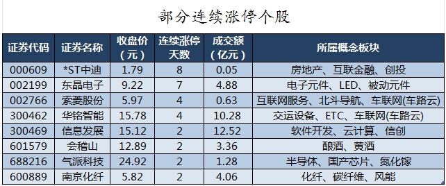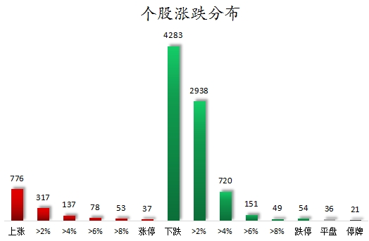 截至收盘,沪深两市合计776只个股上涨,4283只个股下跌,平盘个股36只,停牌的个股21只。不含当日上市新股,共有37只个股涨停,54只个股跌停。连续涨停天数看,*ST中迪已连收8个涨停板,连续涨停板数量最多。