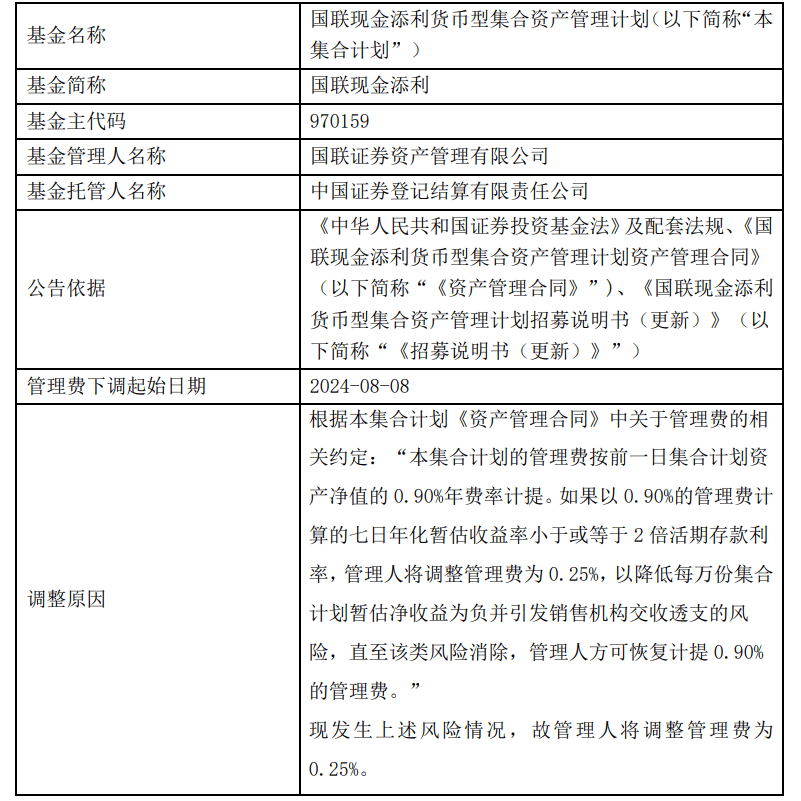 今日,国联证券资管公告称,自8月8日起将国联现金添利的管理费调整为0.25%,而在调整之前,该基金的管理费是按前一日集合计划资产净值的0.9%年费率计提。