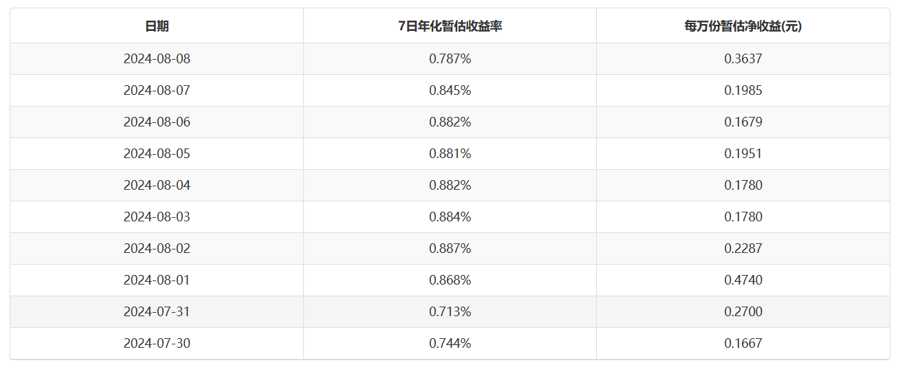 公开资料显示,8月8日国联现金添利的7日年化收益率仅有0.787%,不过在管理费调整之后,每万份收益为0.3637元。