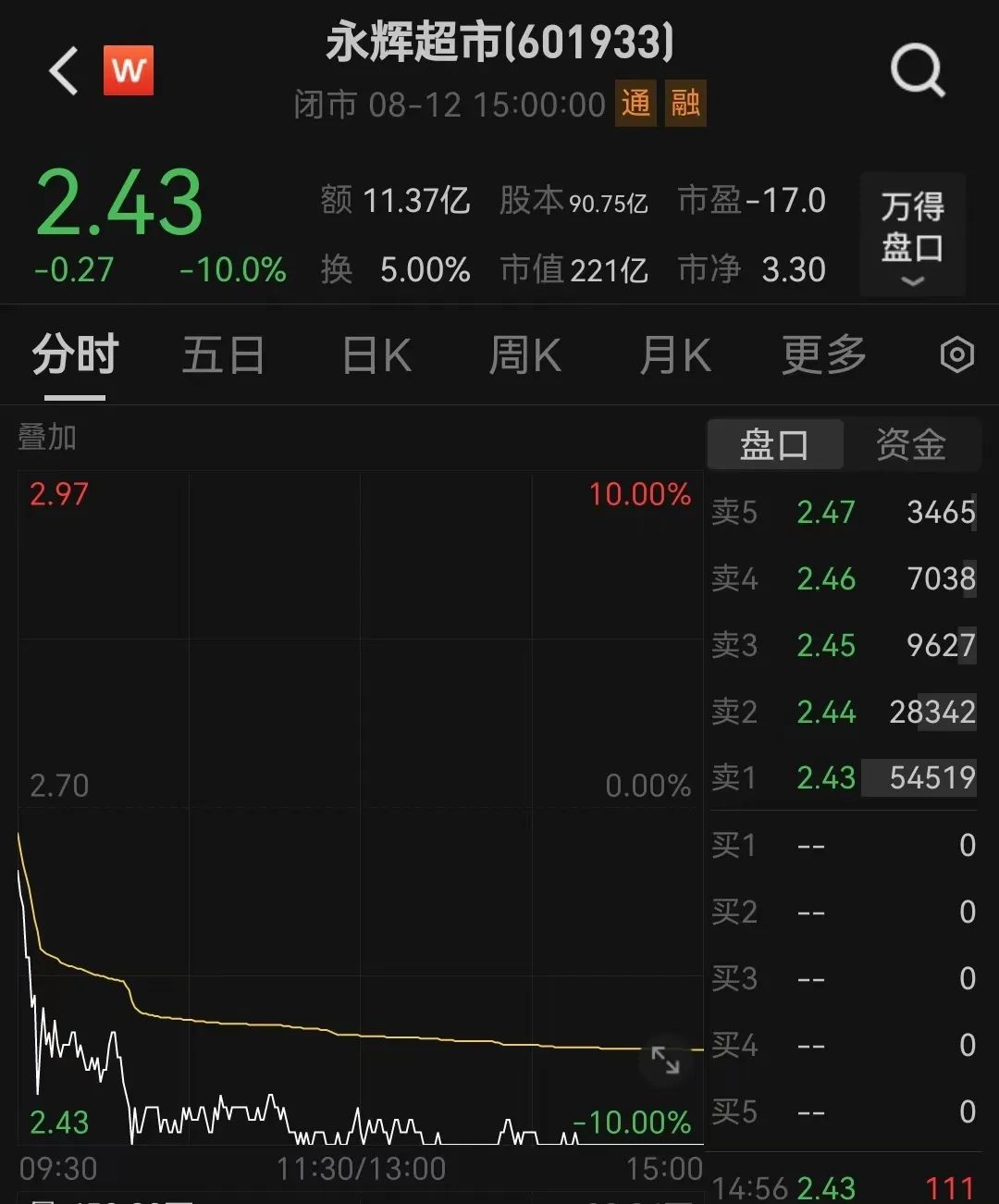 零售板块,今日永辉超市(601933)、中央商场(600280)跌停。南京商旅、国光连锁、中百集团(000759)、南宁百货(600712)、友好集团(600778)、申华控股(600653)等跌幅居前。永辉超市在8月7日、8日连续两个交易日涨停后,今日股价触及跌停。