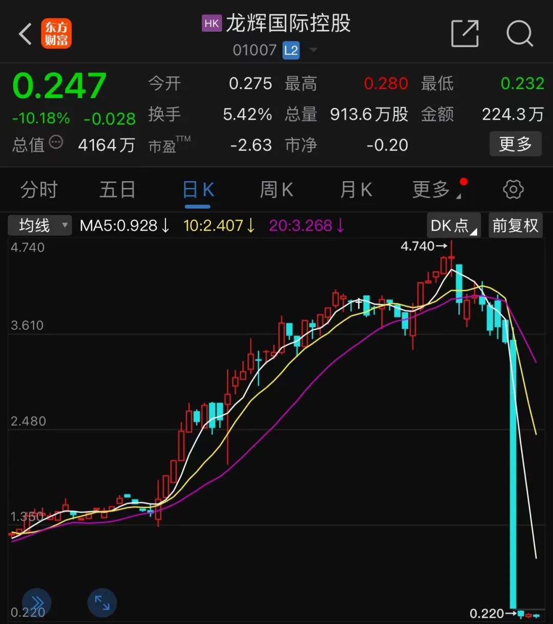 8月7日一度暴跌90%的港股餐饮公司龙辉国际控股今日继续大跌。截至发稿,龙辉国际控股跌近10%,早盘其股价一度跌近15%,目前公司市值仅剩约4000万港元。