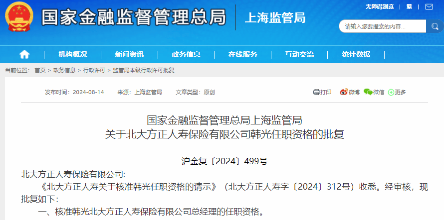 8月14日,国家金融监督管理总局上海监管局发布行政批复显示,核准韩光北大方正人寿保险有限公司总经理的任职资格。
