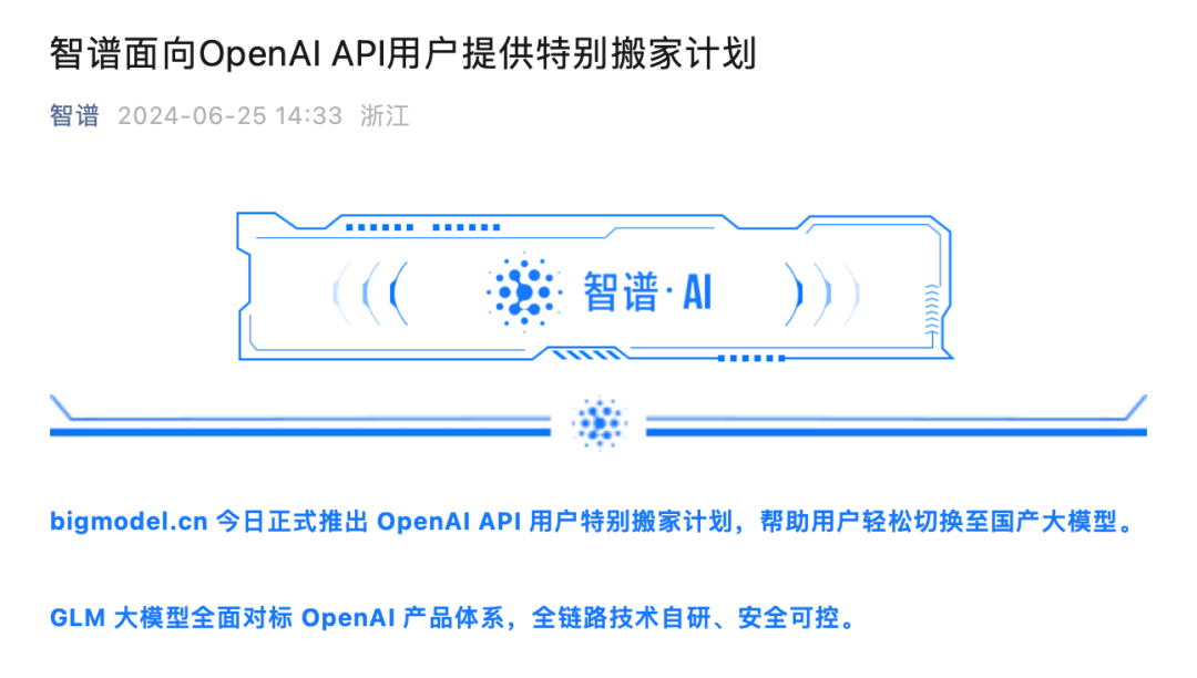 除了百度、阿里等大厂,大模型创业公司智谱AI也推出相关的迁移方案。据了解,智谱AI为OpenAIAPI用户提供特别搬家计划,帮助用户轻松切换至国产大模型。具体而言,开发者可以获得1.5亿Token(5000万GLM-4+1亿GLM-4-Air),以及从OpenAI到智谱AI旗下的GLM大模型的系列迁移培训。对于高质量客户,智谱AI还将提供与OpenAI使用规模对等的Token赠送计划(不设上限)、与OpenAI对等的并发规模、匹配高等级会员政策、专属搬家顾问及5人天技术专家支持、备案培训和辅助。