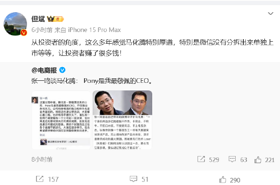 8月19日,但斌在微博转发了媒体发布的一篇“张一鸣谈马化腾:Pony是我最敬佩的CEO”时配文称,从投资者的角度,这么多年感觉马化腾特别厚道,特别是微信没有分拆出来单独上市等等,让投资者赚了很多钱。
