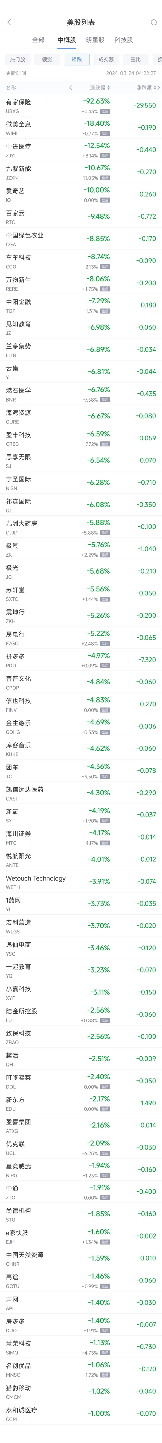 下跌股当中(按市值降序排列),拼多多跌4.97%,网易跌0.21%,百度跌0.10%,携程跌0.99%,理想汽车跌0.61%,百济神州跌0.93%,腾讯音乐跌0.10%,中通跌1.95%,新东方跌2.18%,华住酒店集团跌0.14%,满帮跌1.05%,名创优品跌1.00%,极氪跌6.13%,360数科跌0.71%。