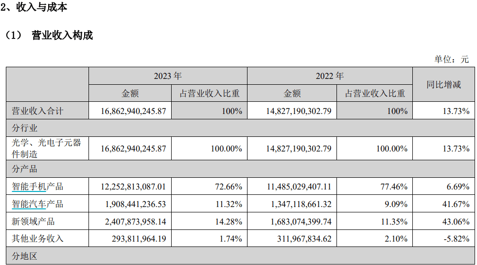 欧菲光2023年年报显示,公司实现收入168.6亿元,同比增长13.73%,净利润7690.5万元,实现了扭亏为盈。从细分产品来看,除收入占比72.66%的智能手机产品,欧菲光的智能汽车产品收入占比为11.32%,新领域产品占比14.28%,二者均同比增长超40%。