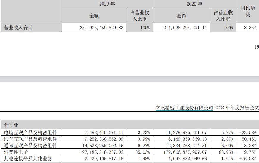 2023年财报显示,立讯精密实现收入2319亿元,较上年同期增长8.35%。汽车互联及精密组件收入占比3.99%,同比增长50.46%,在所有业务板块中增速最快。此前,有相关知情人士接受时代周报记者采访时透露,目前通讯和汽车板块已经成长为立讯精密的第二增长曲线,未来立讯精密会将资源向这两个业务板块倾斜和导入,推动这两块业务的高速成长。