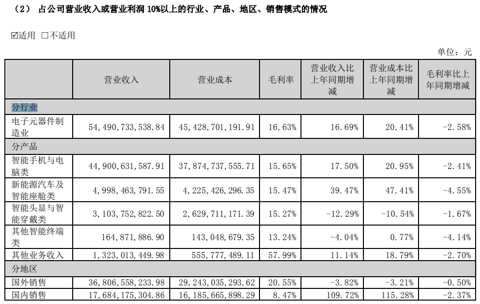 与另外几家果链企业不同,歌尔股份在2023年年报中并未将汽车业务单列,目前尚未知其具体占比情况。