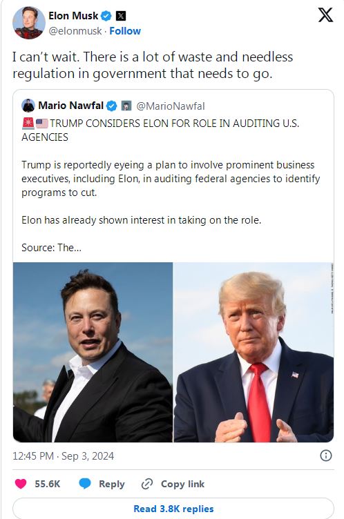 针对这一消息,马斯克周二在X上发帖称:“我都迫不及待了。政府中有很多浪费和不必要的监管需要取消。”