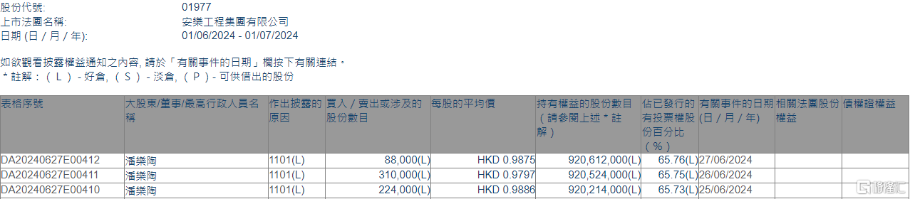 格隆汇10月4日丨根据联交所最新权益披露资料显示,2024年9月27日及9月30日,安乐工程(01977.HK 获执行董事潘乐陶在场内以每股均价1.0...