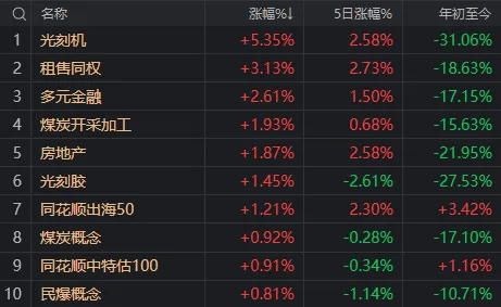 板块方面,光刻机、多元金融、煤炭、房地产等板块涨幅居前,消费电子、电商、ST板块、电子烟等板块跌幅居前。