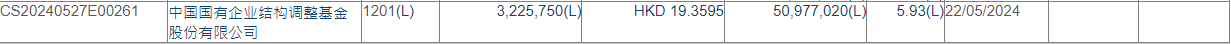 减持后,中国国有企业结构调整基金股份有限公司最新持股数目为5097.702万股,持股比例由6.31%下降至5.93%。