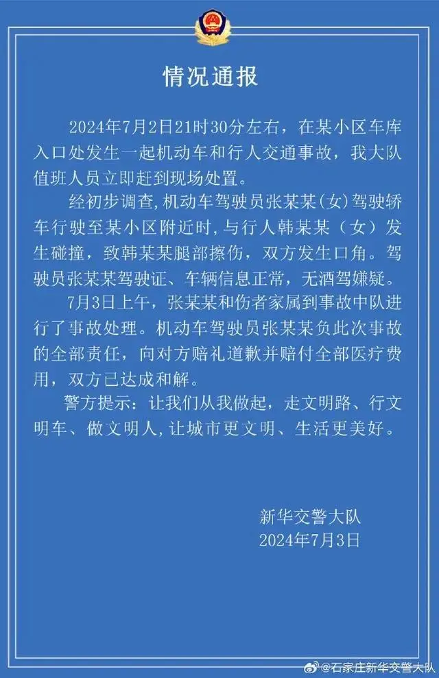 7月3日,石家庄新华交警大队对外通报了一起发生在7月2日晚上21时30分左右的交通事故。事故地点位于某小区车库入口处,涉事驾驶员张某某(女)驾驶轿车在该小区附近与行人韩某某(女)发生碰撞,导致韩某某腿部擦伤,并引发双方口角。