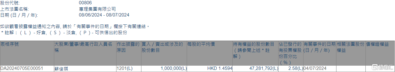 格隆汇7月8日丨根据联交所最新权益披露资料显示,2024年7月4日,惠理集团(00806.HK)遭执行董事苏俊祺在场内以每股均价1.4594港元减持100万股,涉资约145.94万港元。