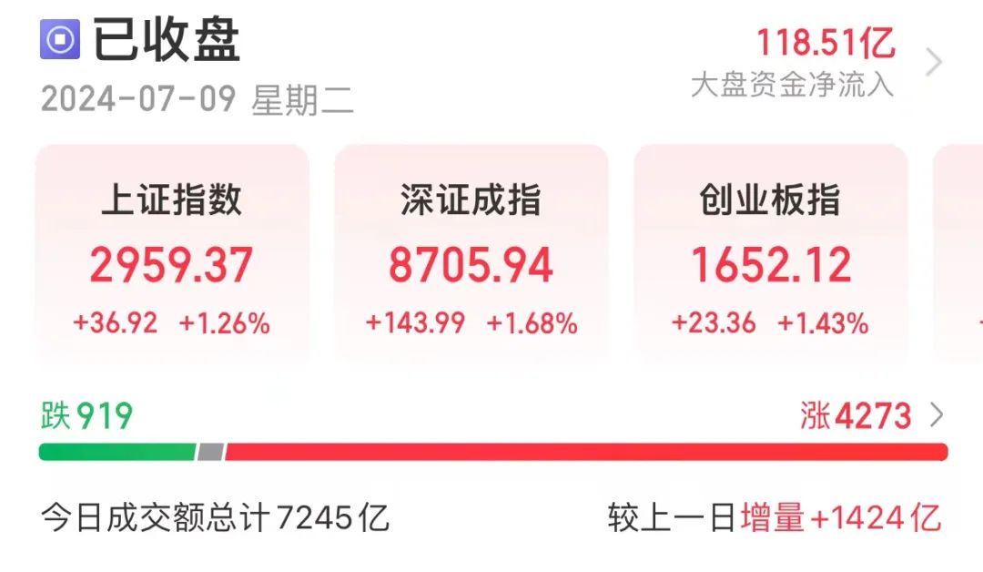 今日A股集体大反弹。截至收盘,上证指数大涨1.26%,收报2959.37点;创业板指大涨1.43%,收报1652.12点。31个申万一级行业仅农林牧渔、建筑材料两个板块指数下跌,电子指数大涨4.62%居首,通信、汽车等指数均涨超3%。