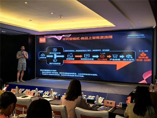 Temu的代表守仁以《TEMU 2024发展规划及境外本对本半托管模式及入驻福利》为题,分享了Temu在拓展全球市场、优化物流体系方面的最新进展,并详细解读了境外本对本半托管模式及入驻福利,为商家提供了更广阔的市场空间和发展机遇。