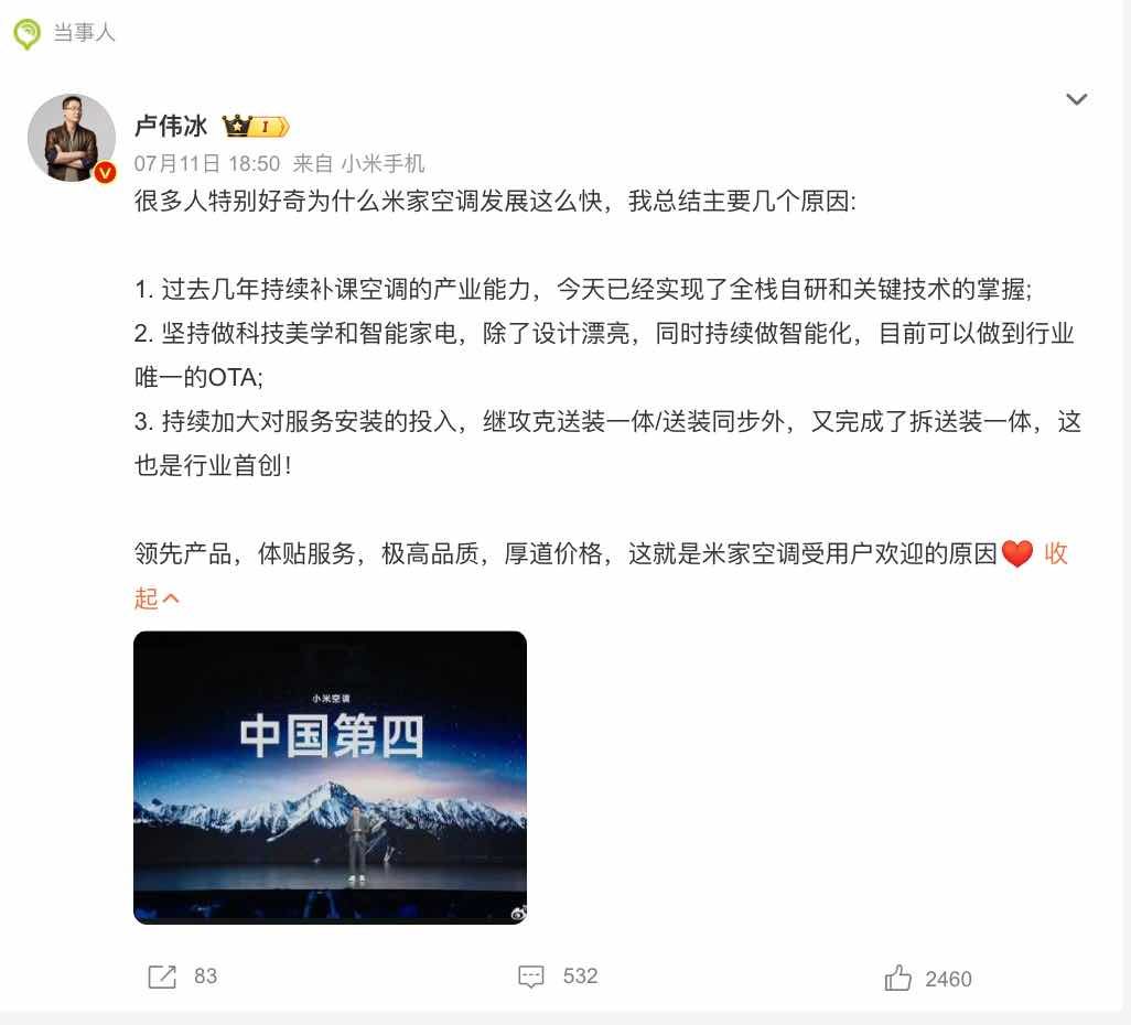 卢伟冰回应董明珠质疑小米没技术:小米空调已实现全栈自研和关键技术的掌握