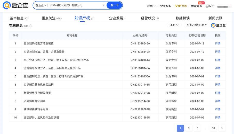 据爱企查App显示,小米科技(武汉)有限公司已申请500余项专利,专利类型涵盖发明专利与实用新型,其中绝大多数为实用新型。值得一提的是,在500余项专利申请中,空调相关专利申请超400项,涉及空调负载控制电路、空调外机的散热处理方法、空调中隔板等,其中大部分已经获授权。