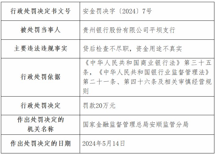5月23日金融一线消息,国家金融监督管理总局安顺监管分局行政处罚信息公开表显示,贵州银行股份有限公司平坝支行因贷后检查不尽职,资金用途不真实,被罚款20万元。