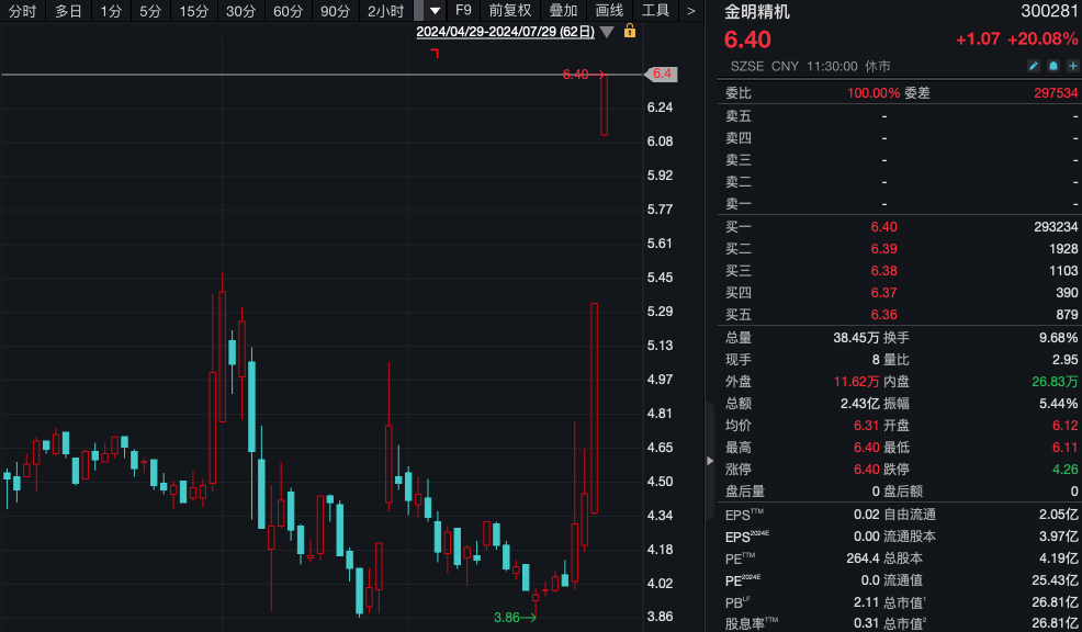 旗天科技连续第2日开盘20%一字涨停;金明精机(300281)高开后亦秒速20cm封板,同样连续2日涨停,股价创2年半来新高。