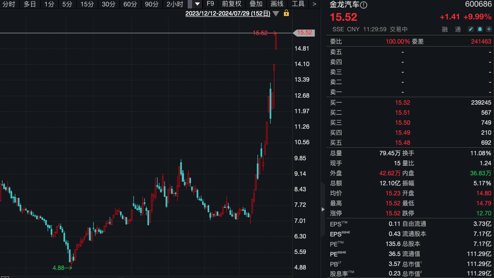 金龙汽车14个交易日内实现8涨停,累计大涨112%。交运股份(600676)、宝塔实业(000595)、中通客车(000957)、潍柴重机(000880)等均走出连续涨停的行情。