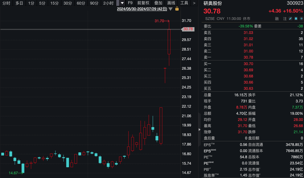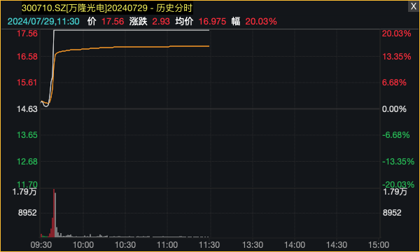 万隆光电开盘不到10分钟垂直20%涨停;研奥股份在连续2日20cm涨停后,今日盘中再度触及涨停;启明信息(002232)开盘一字涨停,近5日4涨停,股价创年内新高;航天晨光(600501)、万集科技(300552)等批量涨停或涨超10%。