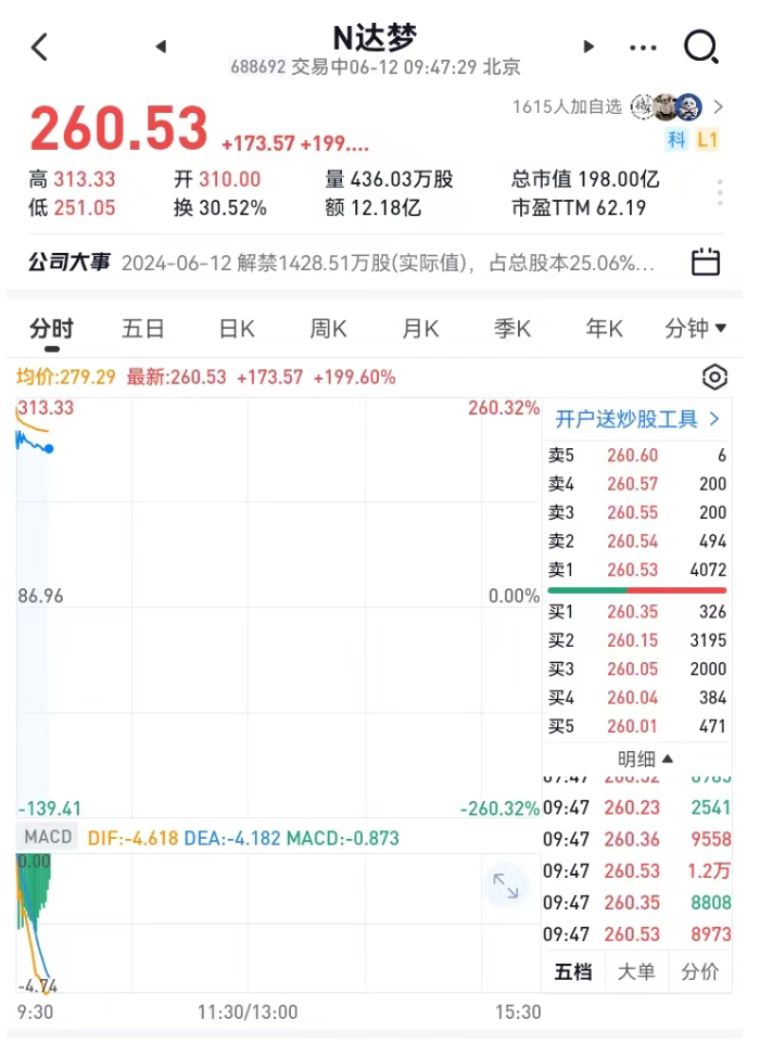 行情数据显示,达梦数据今日开盘即涨256.49%,开盘价为310元,截至发稿,盘中最高上冲至313.33元,随后公司股价开始震荡回落,跌至250元附近。