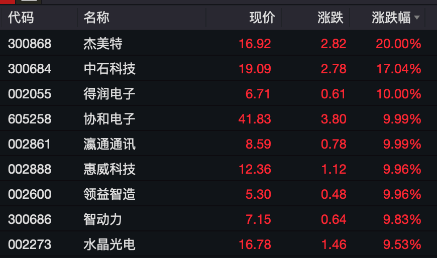 行情数据显示,电子板块中,杰美特今日涨20%,中石科技(300684)涨超17%,得润电子(002055)、协和电子、瀛通通讯(002861)等多股涨停。