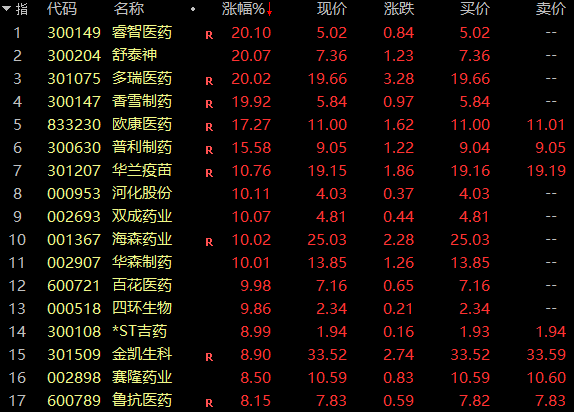 减肥药、创新药、肝炎概念、免疫治理等也纷纷大涨,舒泰神(300204)、多瑞医药等多股20%涨停,河化股份、双成药业(002693)、海森药业等也批量封板。