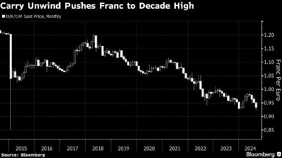 尽管9月瑞士央行连续第三次降息似乎板上钉钉,但这并没有削弱长期投资者和投机资金的兴趣。在借入瑞郎并卖出以买入更高收益货币之后,随着瑞郎作为避险货币的吸引力增加,这些押注正在平仓。
