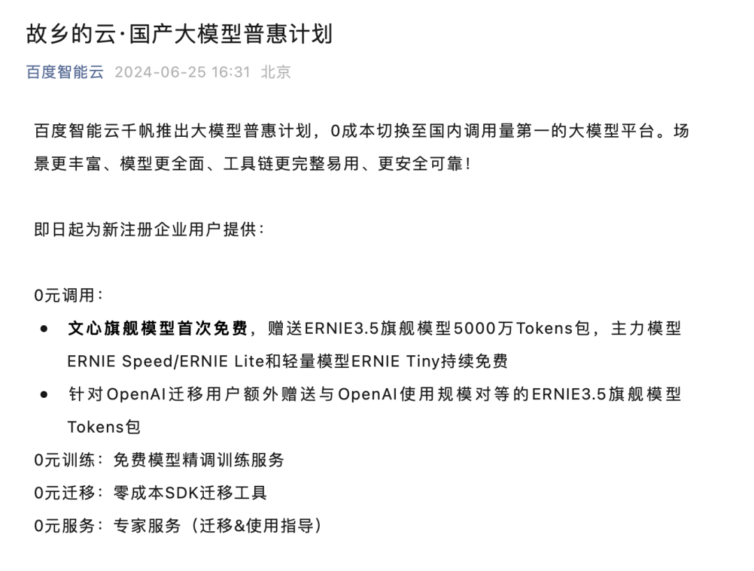 其中,百度推出了“故乡的云・国产大模型普惠计划”。据百度有关负责人介绍,即日起为新注册企业用户提供零成本切换服务(0元调用、0元训练、0元迁移、0元服务)。其中在0元调用方面,文心旗舰模型首次免费,赠送ERNIE3.5旗舰模型5000万Tokens包,主力模型ERNIE Speed/ERNIE Lite和轻量模型ERNIE Tiny持续免费。另外,针对OpenAI迁移用户还将额外赠送与OpenAI使用规模对等的ERNIE3.5旗舰模型Tokens包。